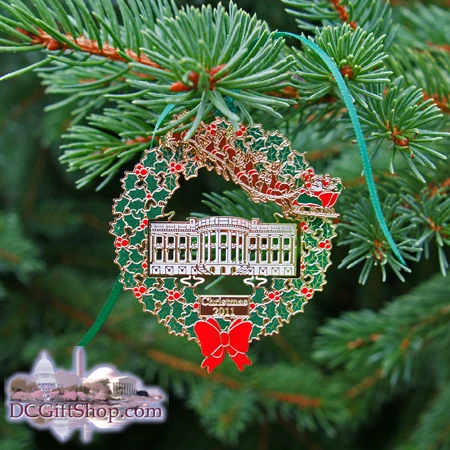 2011 Secret Service ornament features the south entrance to the White House (known as the South Portico) in 3D relief, Santa with his reindeer flying above the scene and complimented by holly leaves and berries.