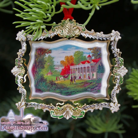 The 2012 Mount Vernon ornament celebrates this kindness with a painting inspired by an original 1878 print of Mount Vernon by artist G. F. Gilman that shows George Washington greeting one of his guests on the lawn. The frame of the ornament is colorfully decorated in a 24K gold finish with a pineapple at the top. The pineapple is largely regarding as a symbol of true hospitality.