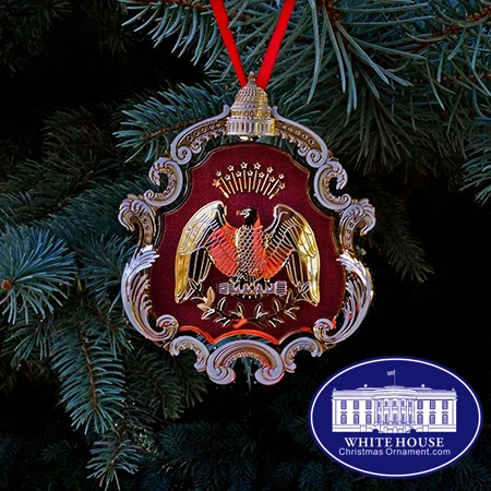 The 2013 Official Ornament of the United States Senate features a three-dimensional gold and crimson eagle surrounded by crimson fabric removed from the Old Senate Chamber. The eagle is modeled after the original eagle that surmounted the dais in the Old Senate Chamber. Shaped like the historic gilded shield on which the eagle stands in the Chamber, the ornament is finished in 24 kt gold etched with acanthus leaves and is topped with a representation of the United States Capitol dome.