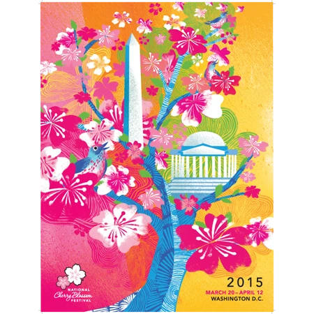 The National Cherry Blossom Festival has selected Jing Jing Tsong from the Big Island, Hawaii as the 2015 Official Artist. She is critically acclaimed for her illustration work that combines traditional printmaking and digital techniques to create vibrant compositions of color, pattern and texture. Jing Jing created a one-of-a-kind piece exclusively for the National Cherry Blossom Festival. An annual collector’s item, the artwork will be on the official poster and various merchandise.