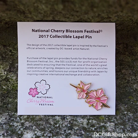The 2017 Official Cherry Blossom pin has a modern design that appeals to all ages. Its soft pink hues and geometric lines give it a balanced beauty that will enhance any outfit.