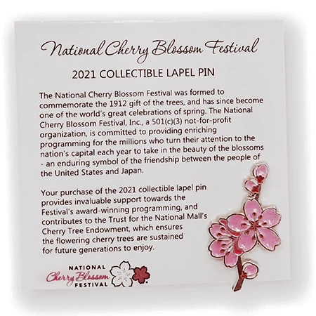 Your purchase of the 2021 NCBF collectible pin contributes to the Trust for the National Mall’s Cherry Tree Endowment, which ensures the flowering trees are sustained for future generations to enjoy.