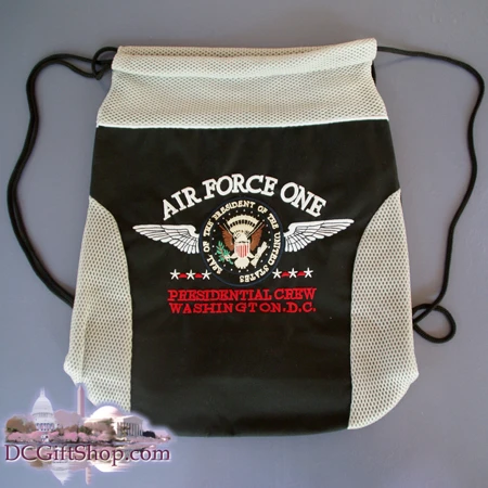 This bag can be used for anything – backpack, beach bag, gym bag, you name it. Complete with a drawstring to guard your items this Air Force One black backpack has the words, “AIR FORCE ONE” above the presidential seal and “PRESIDENTIAL CREW – WASHINGTON D.C.” underneath.