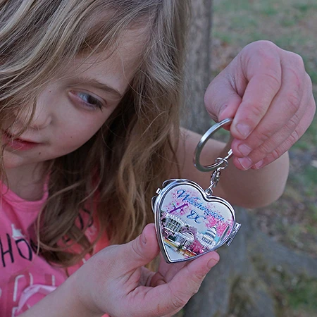 Washington DC Gift Shop is proud to offer our silver-plated folding compact key ring vanity mirrors. This year’s design honors Washington DC’s world-renowned cherry blossom trees that bloom every Spring. Treat yourself to this practical collectible today. This timelessly beautiful charm complements any bag or purse, adding that special touch of brilliant sparkle.