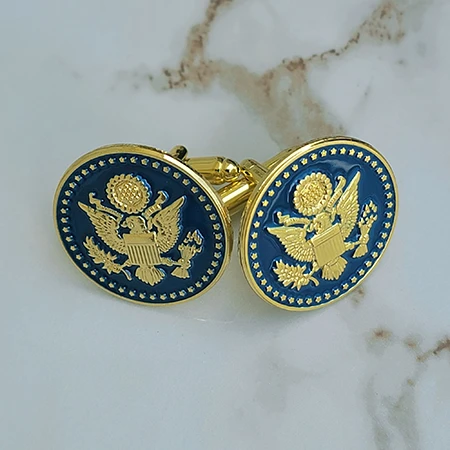 Introducing the Great Seal Cufflinks with navy blue enamel accents – the perfect accessory to add a touch of patriotism and style to your formal attire. These cufflinks feature the Great Seal of the United States, which is a symbol of the country’s authority and sovereignty. The navy blue enamel accents add a pop of color and sophistication to these already impressive accessories.