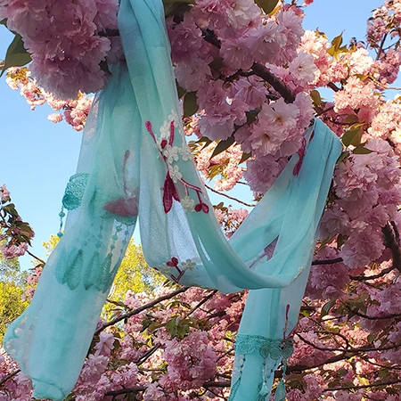 Sakura is the Japanese term for ornamental cherry blossom trees and their blossoms. We are proud to sell the Sakura brand scarves. Enhance the color of any Spring wardrobe with sky blue Sakura scarf hand stitched Japanese cherry blossoms against a background of Sora-iro dyed chiffon.