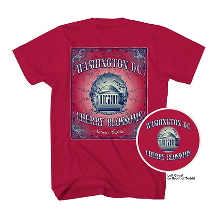 This official National Cherry Blossom Festival unisex cotton Tee Shirt features the Thomas Jefferson Memorial surrounded by filigree branches and Yoshino flowers. On the top of the shirt it states: WASHINGTON D.C. Below the Memorial are the words: CHERRY BLOSSOMS. On the bottom are the words: NATIONS CAPITAL.