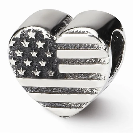Sterling Silver Reflections Heart Flag Bead: Well polished heart shaped bead with flag embedded on it.It has length of 9.09 mm and width of 10.00 mm. With opening diameter of 4 mm, it has antique finish. It is made from Sterling Silver alloy.