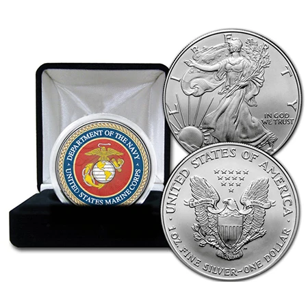 Painted over top of the face of a real Kennedy half-dollar is the official seal of the United States Marine Corps. The traditional Eagle, Globe, and Anchor emblem in gold, with the Globe and anchor rope in silver. The eagle is depicted with wings displayed, standing upon the western hemisphere of the terrestrial globe, and holding in his beak a white ribbon bearing the Marine Corps motto “Semper Fidelis” (Always Faithful) with the hemisphere superimposed on a fouled anchor. An American Bald Eagle replaced the crested eagle depicted on the 1868 emblem.