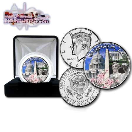 Painted over top of the face of a real Kennedy half-dollar is a beautiful, full color collage of Washington DC’s most famous landmarks including the US Capitol Building, the Washington Monument, the statue of Abraham Lincoln sitting in his massive memorial, the south portico of the White House and several in-bloom cherry blossom branches.