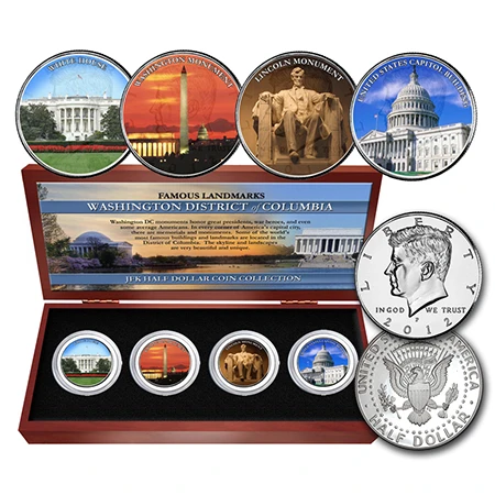 The DC Landmarks Four Coin makes a great addition to any collection, collectors will love it, this commemorative set half dollars features the White House, Washington Monument, Lincoln Memorial & U.S. Capitol Building, and it comes with a certificate of Authenticity in classy wooden display case.