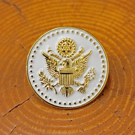 The raised Great Seal of the United States is set on a white enamel finish background for a very distinguished feel. These exquisite handmade 24 karat gold finish cufflinks and lapel pin by POTUS1 feature a bold eagle with highly detailed accents in a classic round shape that are perfect for any formal attire dress function.
