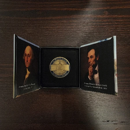 White House Challenge Coin features the North Portico on the front and the South Portico on the back. Arrives in a beautiful presentation box ready to be gifted.