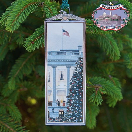 Non tarnishing silver bookmark and ornament features a giclee print of the White House Christmas Tree Lighting Ceremony, December 1941 by Tom Freeman. Put it on your tree and then use it as an elegant bookmark.